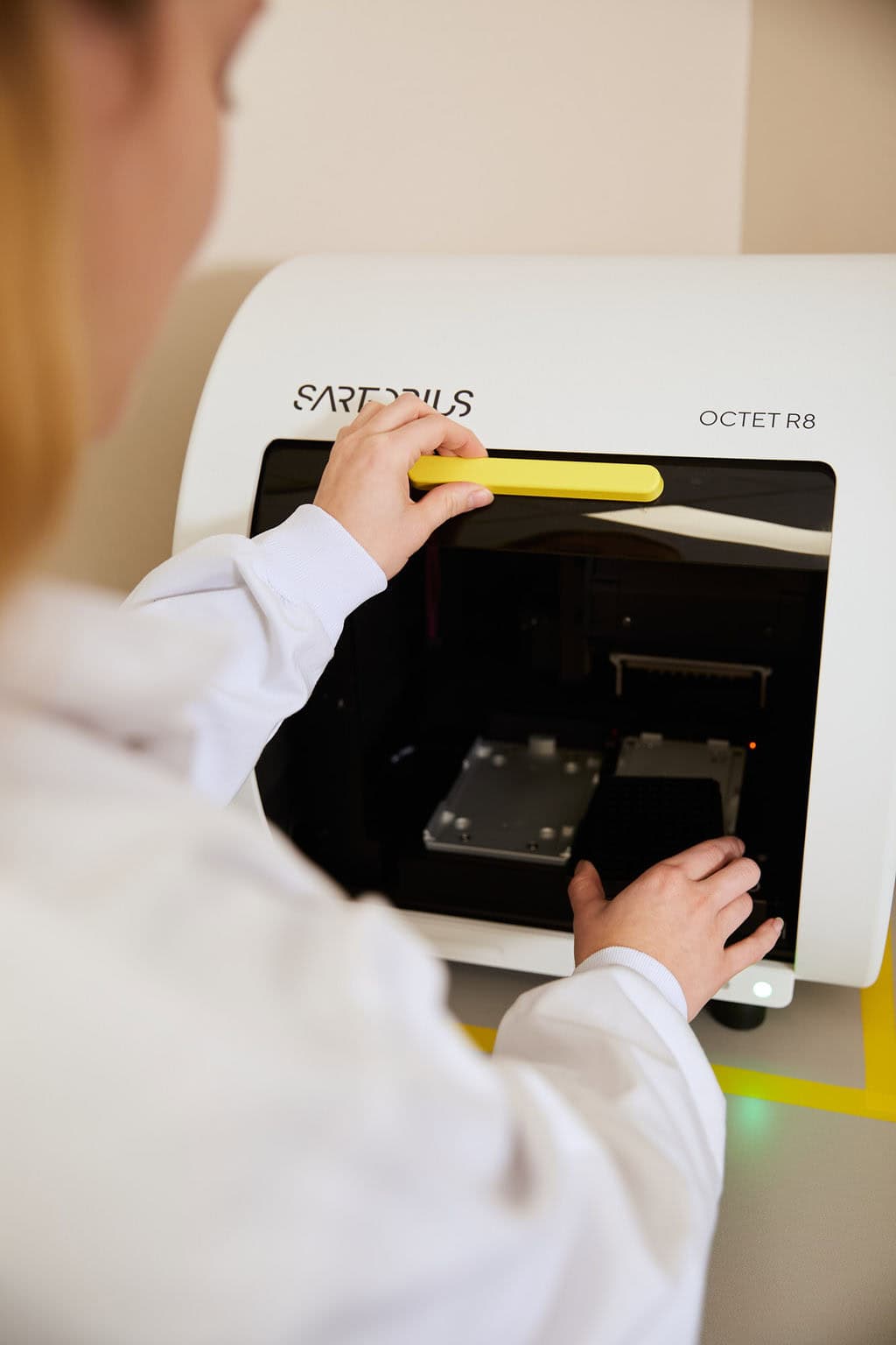 The Octet R8 system is equipped with eight spectrophotometers, enabling simultaneous analysis of up to eight samples. The instrument utilizes glass biosensors each approximately the size of a 10 µL pipette tip coated with a specific biological component. Depending on the application and experimental goals, different biosensor types can be selected for optimal performance.