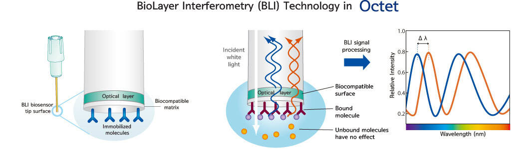 During an experiment, the biosensors of the Octet are illuminated with white light. The reflection of this light from the biosensors immersed in buffer serves as a reference signal (blue). When molecules such as immobilized proteins bind to the biosensor surface, the optical properties change, causing a measurable shift in the interference pattern (orange). This shift, represented as a change in wavelength (Δλ), is directly proportional to the number of bound molecules. Because Biolayer Interferometry (BLI) measures these changes in real time, it enables precise determination of key kinetic parameters, including association, dissociation, affinity, and concentration. The resulting data are displayed as a binding curve, plotting the wavelength shift against time.
